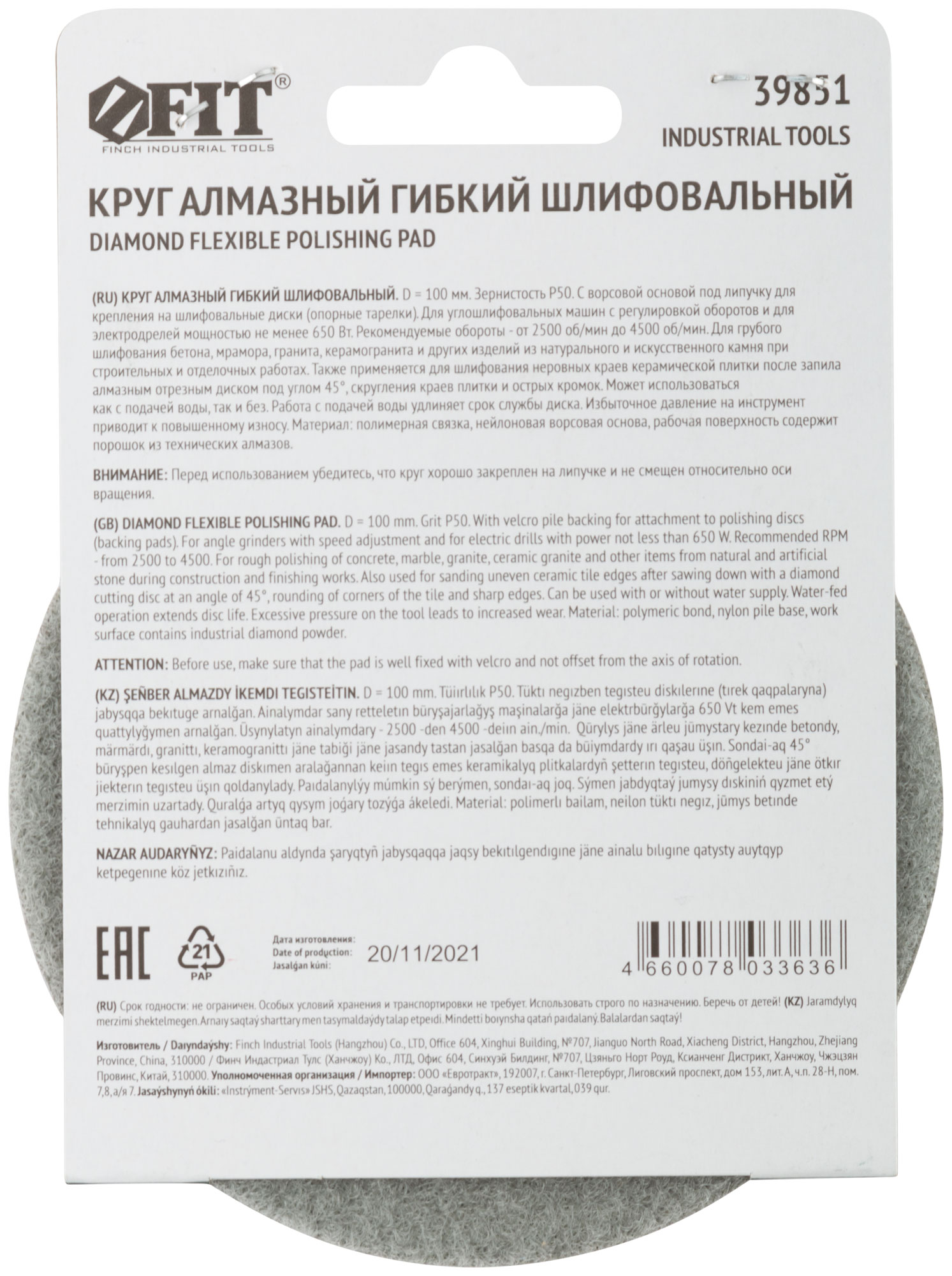Круг оснащен ворсовой основой, которая позволяет надежно крепить его на шлифовальные диски с липучкой. Его рабочая поверхность содержит порошок из технических алмазов, что обеспечивает высокую производительность и долговечность.