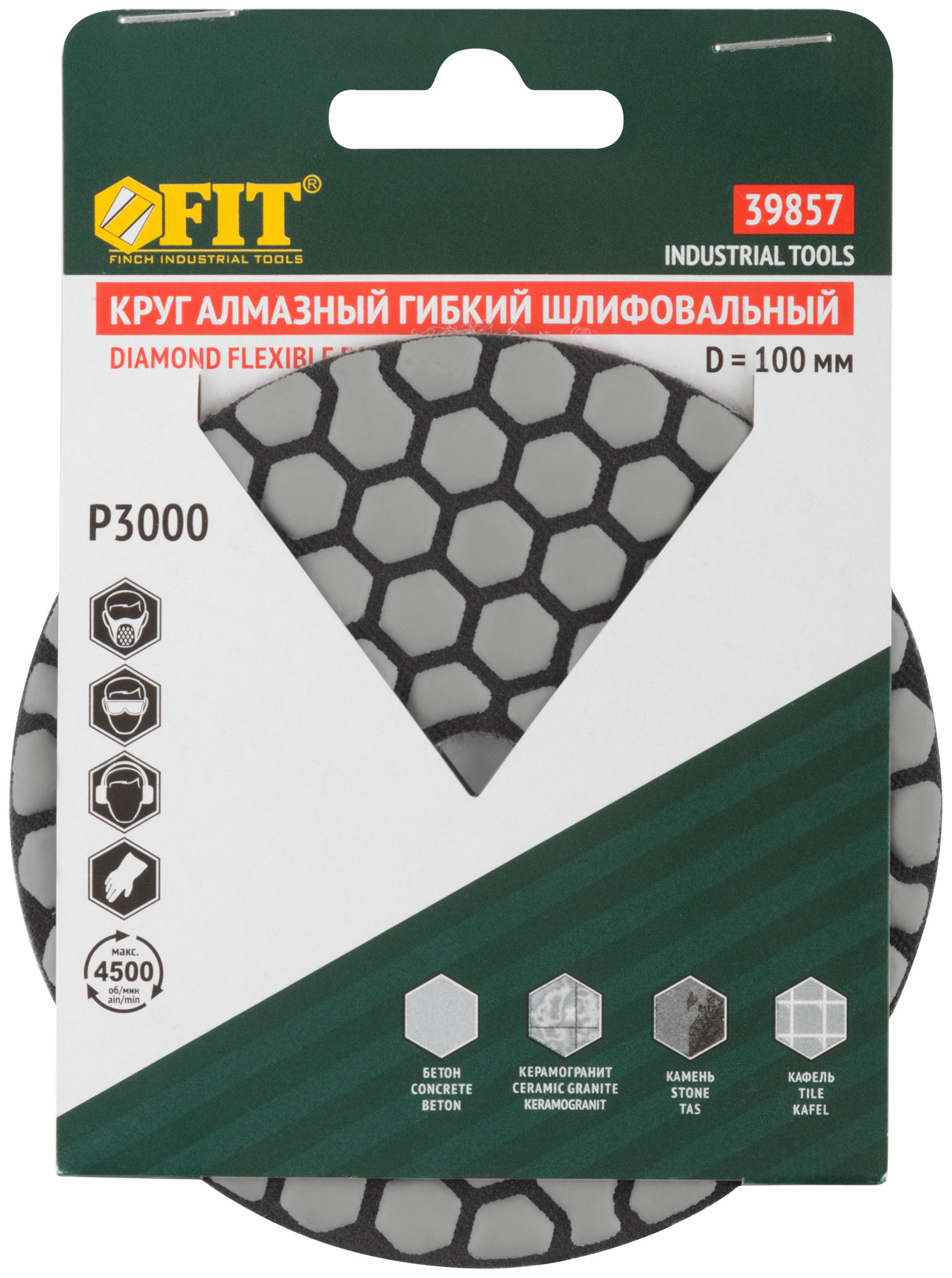 Этот алмазный гибкий шлифовальный круг диаметром 100 мм и зернистостью P3000 от бренда FIT предназначен для сухого шлифования таких материалов, как бетон, мрамор, гранит и керамогранит. Он особенно полезен при обработке неровных краев керамической плитки после запила под углом 45°.