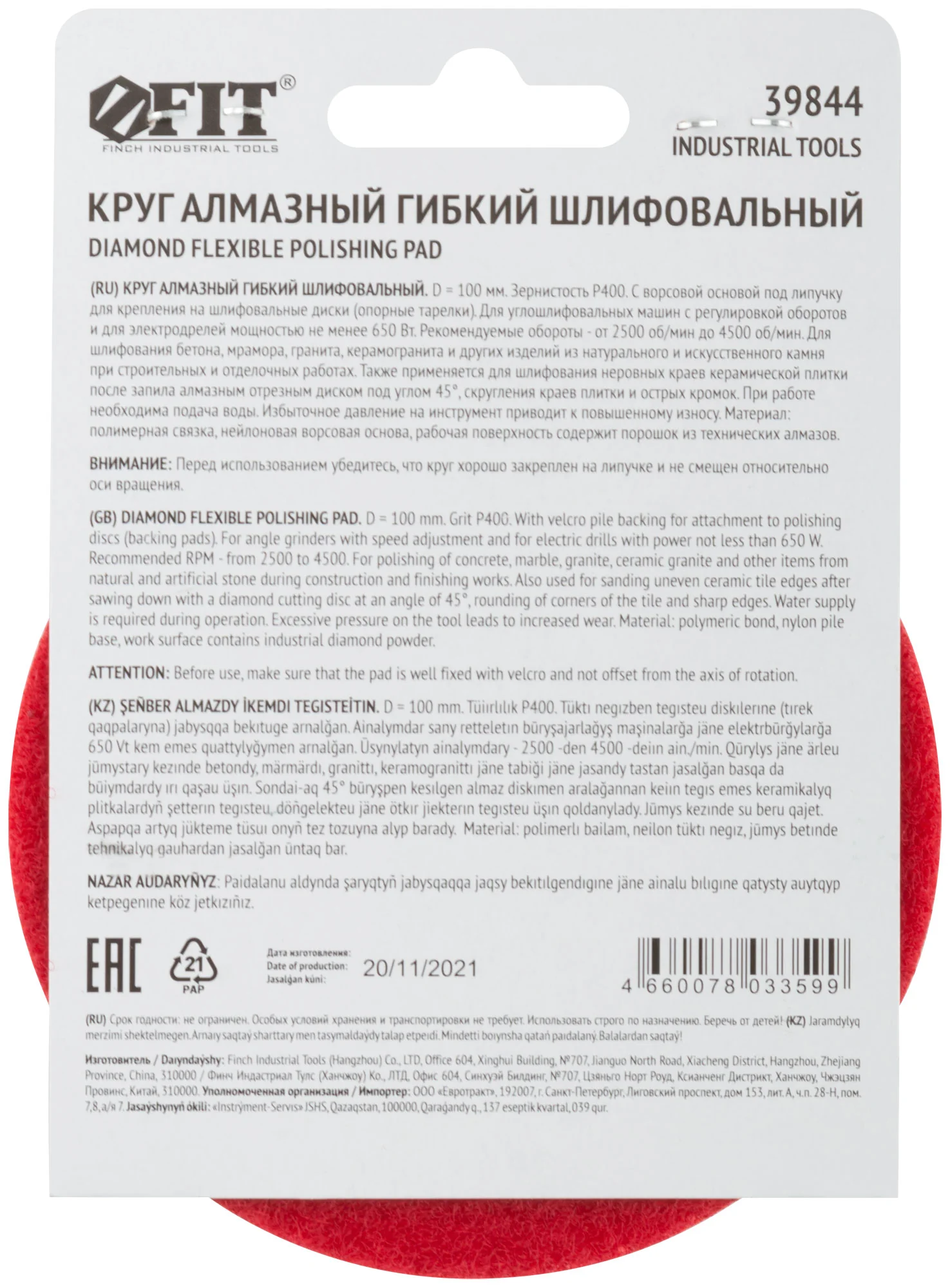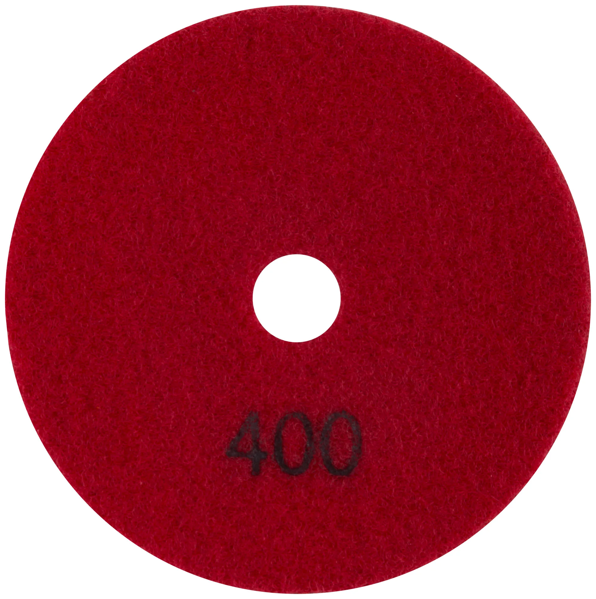 Круг оснащен ворсовой основой под липучку, что позволяет легко крепить его на шлифовальные диски или опорные тарелки. Рабочая поверхность содержит порошок из технических алмазов, обеспечивая высокую износостойкость и производительность. Для работы необходима подача воды, что позволяет избежать перегрева и увеличивает срок службы.