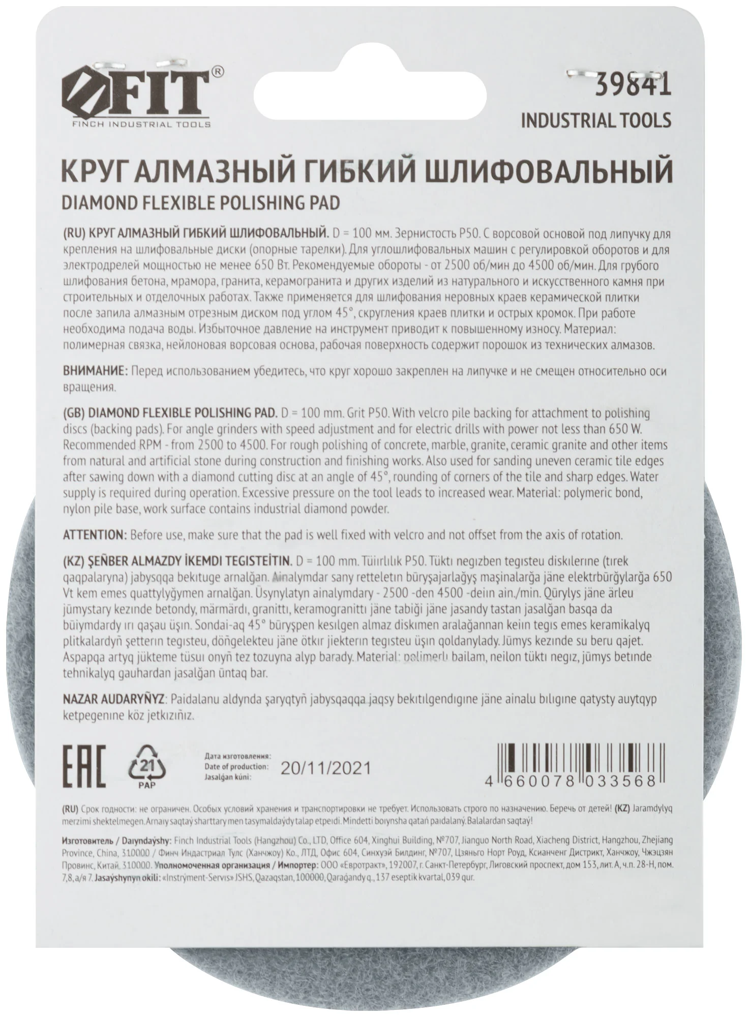 Выберите алмазный гибкий шлифовальный круг 39841 от FIT, чтобы обеспечить качественное и долговечное шлифование на вашем объекте.