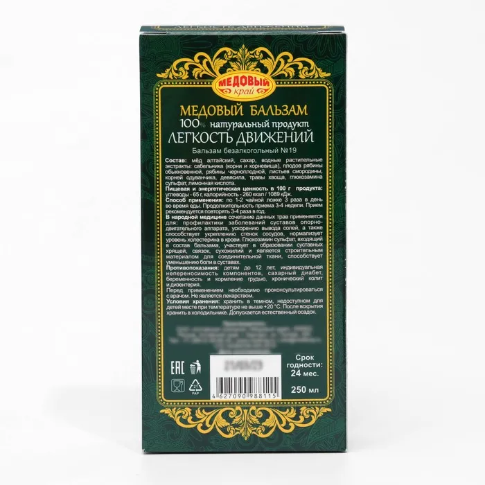 Алтайский медовый бальзам "Легкость движения" - это естественное и эффективное средство для облегчения дискомфорта в мышцах и суставах. Он помогает снять напряжение, повысить подвижность и улучшить самочувствие.