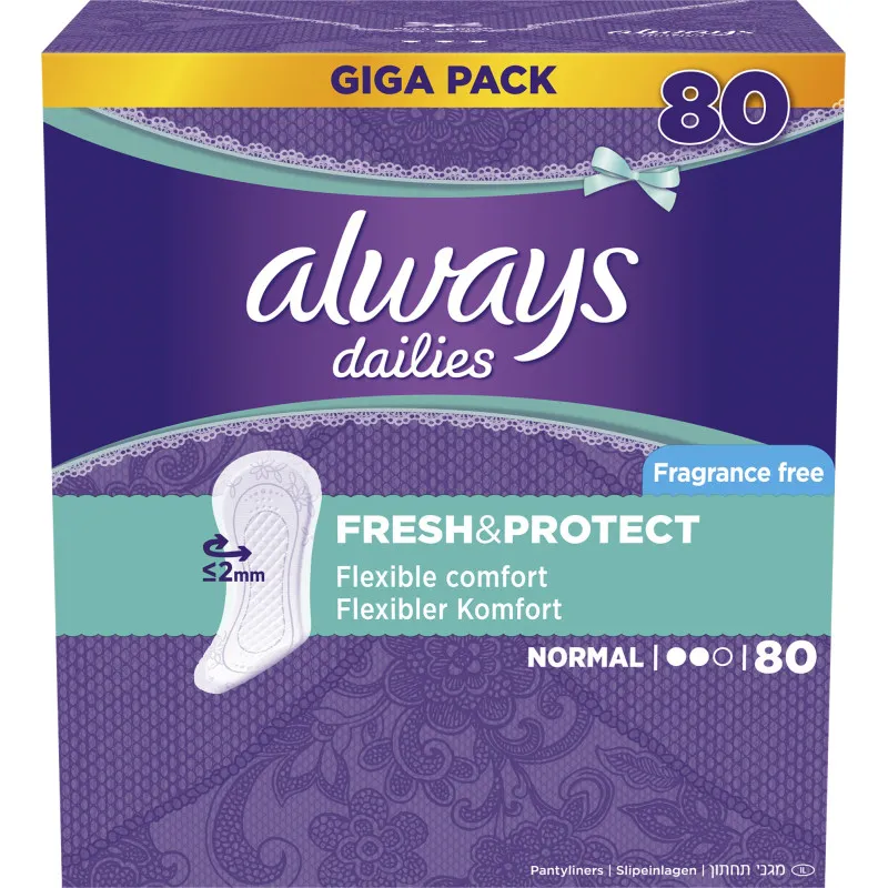 Always Dailies Fresh & Protect Normal - это надежные ежедневные прокладки, которые обеспечивают комфорт и свежесть на весь день. Они идеально подходят для ежедневного использования при выделениях или в качестве дополнительной защиты при нерегулярных менструациях. Упаковка содержит 80 штук, что гарантирует длительное использование.