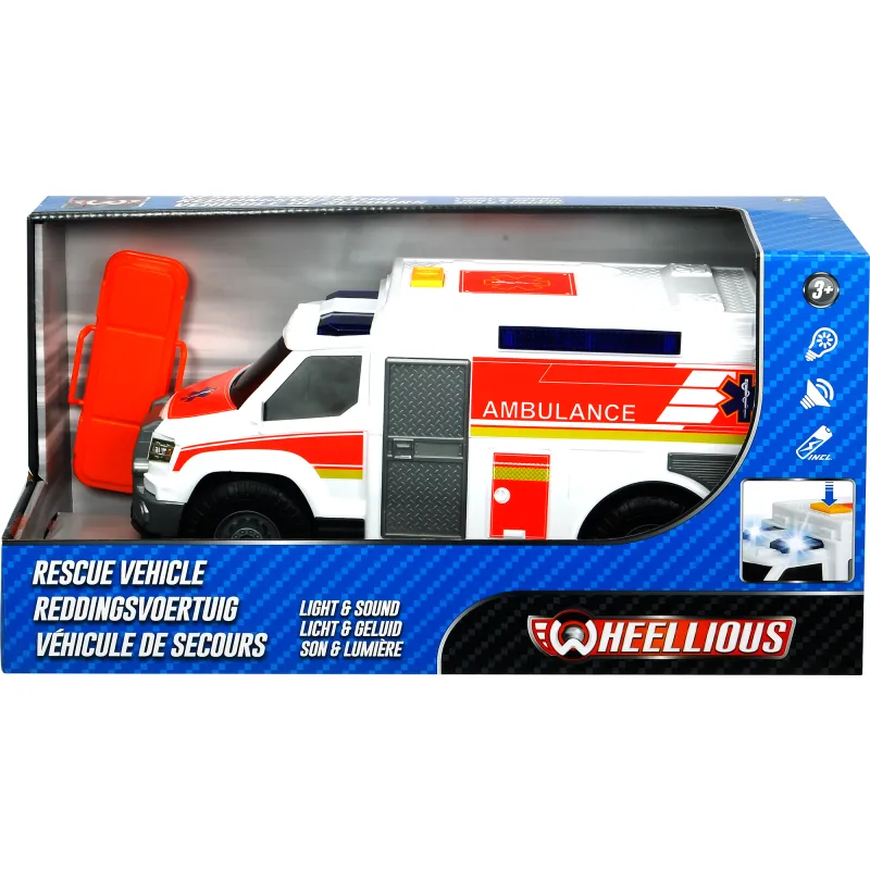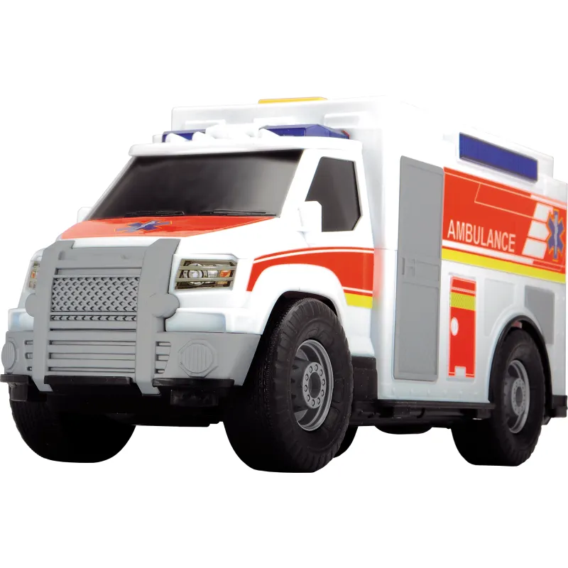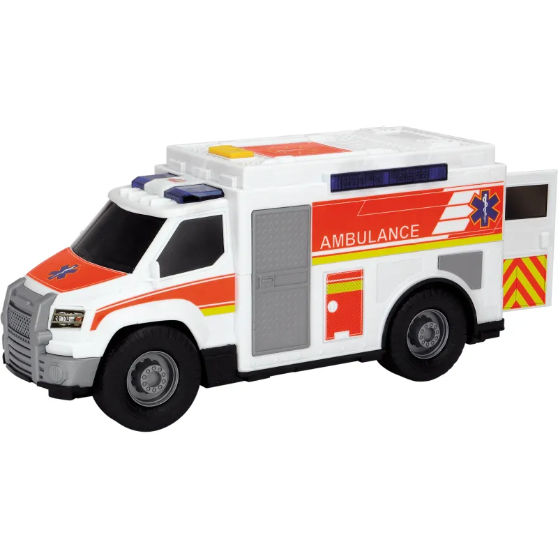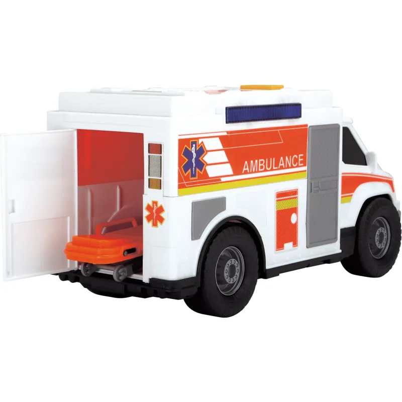 Первыми на месте происшествия: скорая помощь Dickie Toys! Машинка оснащена свободно вращающимися колесами, световыми эффектами и реалистичными звуками, а также открывающимися задними дверями. В комплект входят носилки, с помощью которых транспортировка пациентов становится безопасной и удобной. Питание осуществляется от 2 батареек 1,5V-R6 (AA), которые входят в комплект. Размер машинки составляет 30 см. Подходит для детей от 3 лет.