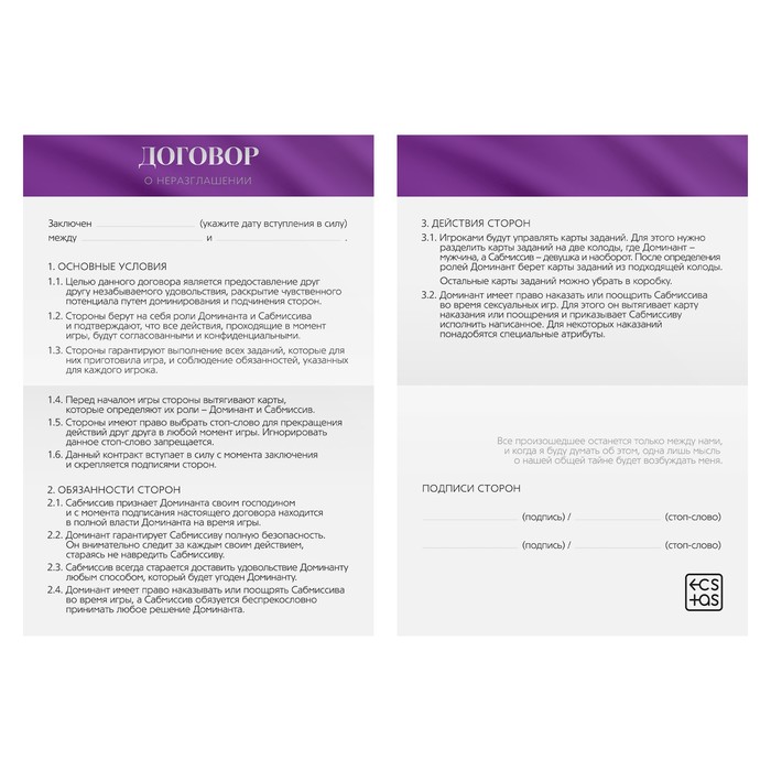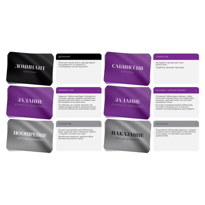 Внутри вы найдёте карты с разными локациями и эротическими идеями, благодаря которым посещение привычных мест в городе уже не будет прежним. Подпишите договор о неразглашении и выберите желаемую роль. Один из вас будет доминирующим (доминантом), а другой — подчиняющимся (сабмиссивом). Выбирайте карты заданий и следуйте инструкциям. Доминирующий может наградить подчиняющегося за покорность, используя карту «Поощрение», либо наказать за непокорность, используя карту «Наказание». В комплекте есть интригующие аксессуары, которые нужно использовать во время игры.