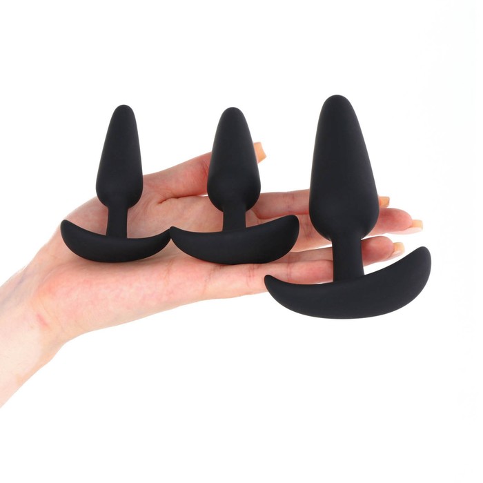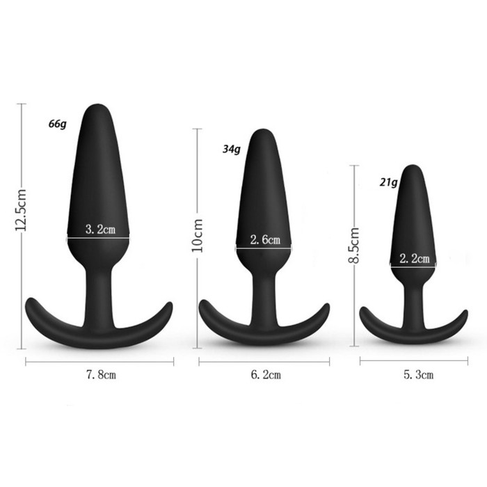 Набор анальных пробок из медицинского силикона . Диаметр пробок: 2,2 см , 2,6 см , 3,2 см. Разный диаметр поможет постепенно растянуть и подготовить мышцу к анальному сексу. Анальные пробки подойдут для ношения, ограничитель на основании в виде якорька не позволит игрушке ускользнуть в прямую кишку. Подарят ощущение наполненности и создадут эффект двойного проникновения. Анальные пробки рекомендуется использовать с лубрикантом для анального секса он предотвратить неприятные ощущения и последствия.