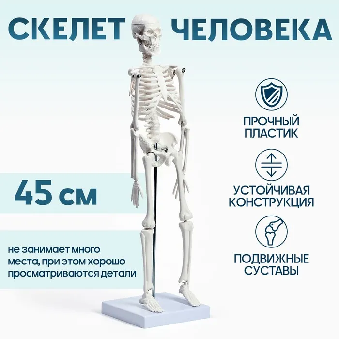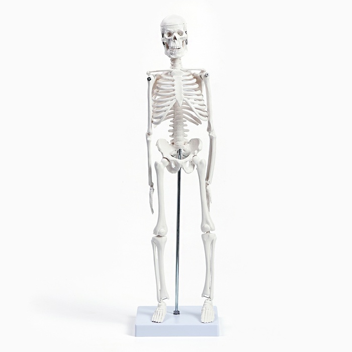 Макет «Скелет взрослого человека» в полный рост можно назвать наглядным учебным пособием для изучения анатомии человека. Модель скелета позволяет изучить строение черепа, позвоночника, грудной клетки, таза, верхних и нижних конечностей.