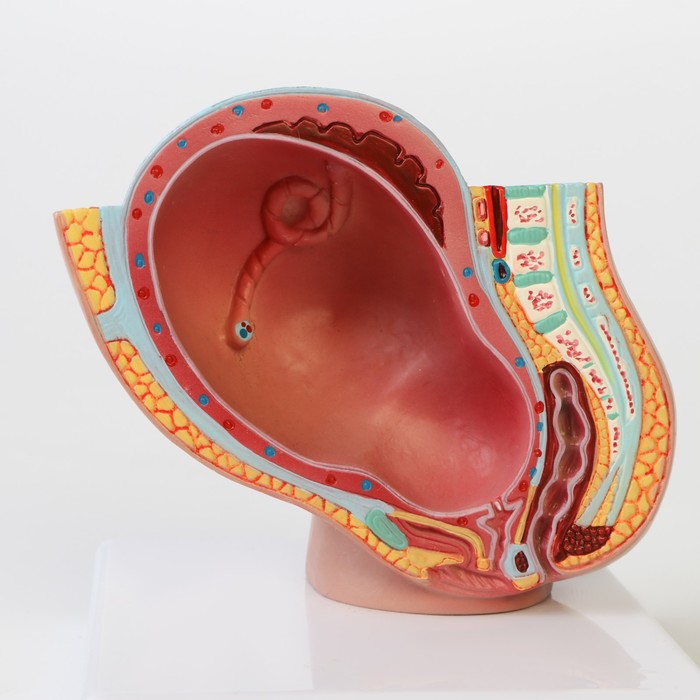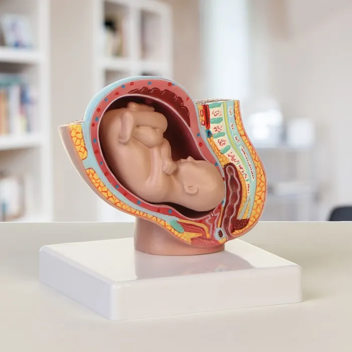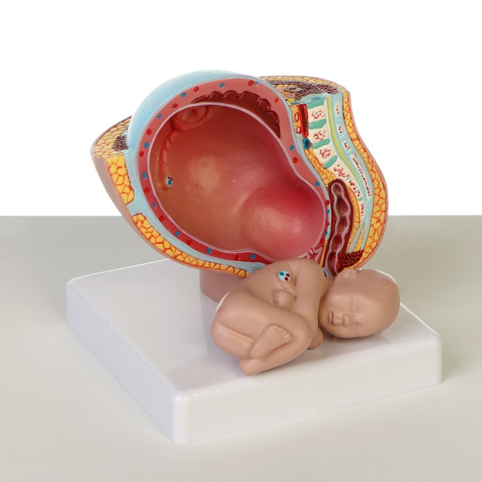 - Детализированная структура: Макет выполнен в виде поперечного сечения и демонстрирует расположение внутренних органов на этапе беременности, включая матку, плаценту и развивающийся плод. Такое исполнение облегчает визуализацию и способствует запоминанию материала.