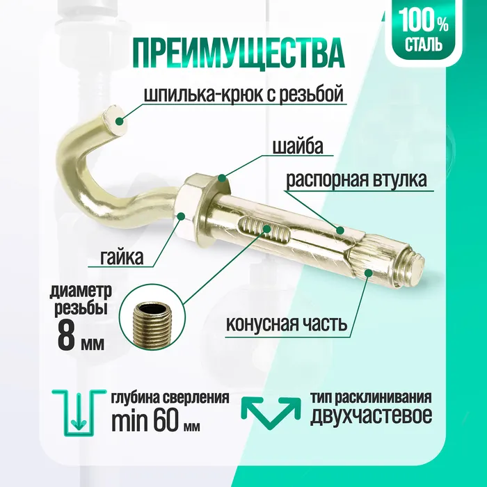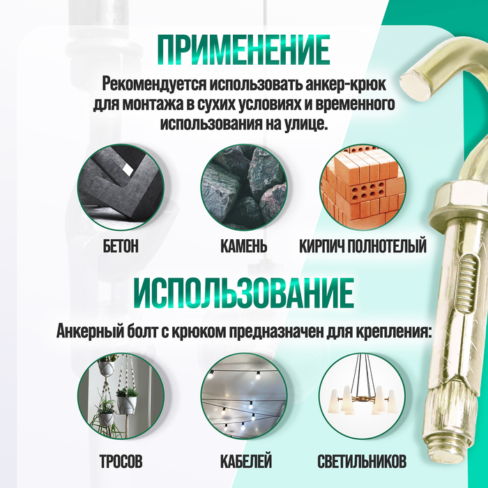 Крюк позволяет надежно закрепить предмет на стене или потолке, а резьба на шпильке обеспечивает надежное крепление к материалу стены или потолка.