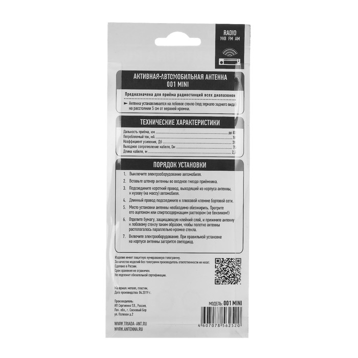 Предназначена для приема радиоволн УКВ, FM в условиях города. Основное преимущество – компактная конструкция и небольшая цена. Хорошо работает на небольших расстояниях от радиовещательных станций. Рекомендуется потребителям, эксплуатирующим автомобиль в основном в пределах города, которые не хотят переплачивать. Если требуется регулировать усиление для уменьшения промышленных и радиопомех вблизи от передающих станций, советуем обратить внимание на антенны ""Триада-002 Mini"".