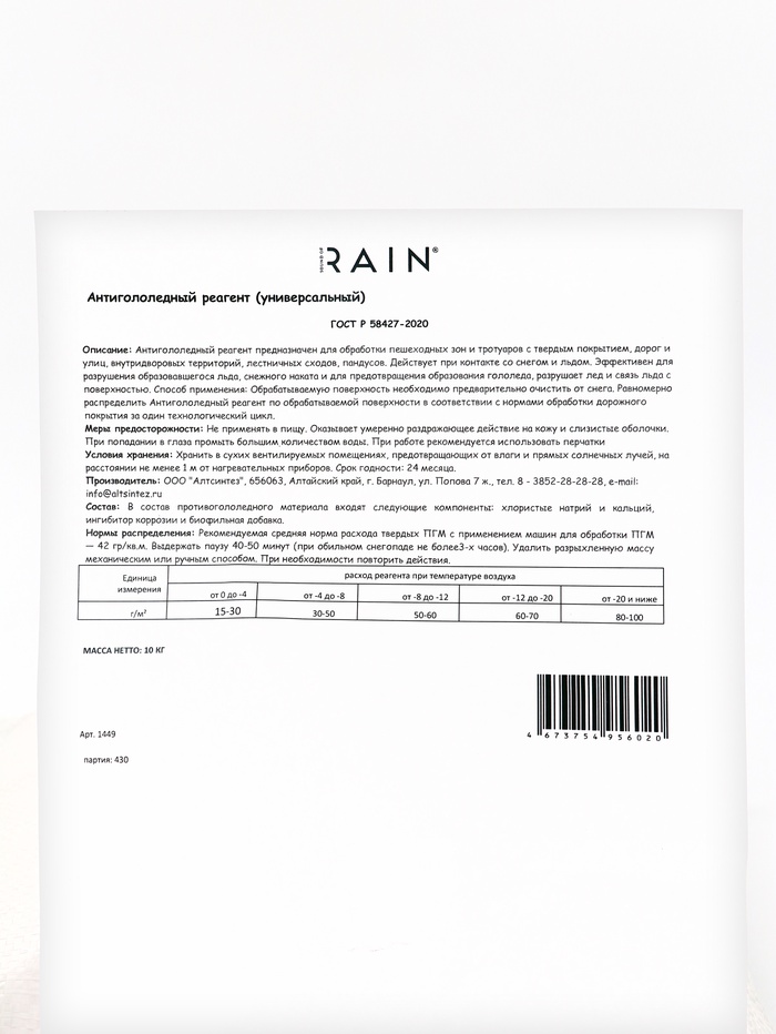 Антигололедный реагент Sound of Rain, универсальный, 10 кг — Характеристики