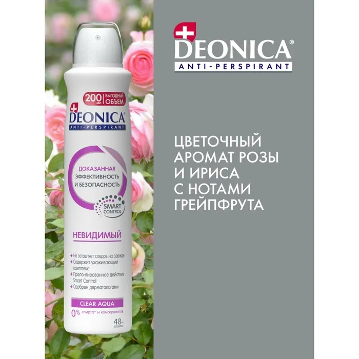 Уникальный **Антиперспирант Deonica "Невидимый" - гарантированно подарит вам защиту и ощущение свежести в течение дня. Благодаря специальной формуле не оставляет следов и пятен на чёрной, белой и цветной одежде и обеспечивает надёжную защиту от пота и запаха на 48 часов.