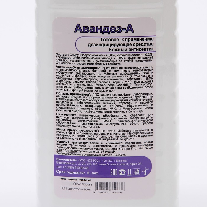 Состав: спирт изопропиловый – 70,0%, 2-феноксиэтанол – 0,2%, алкилдиметилбензиламмоний хлорид – 0,05%, а также функциональные добавки.