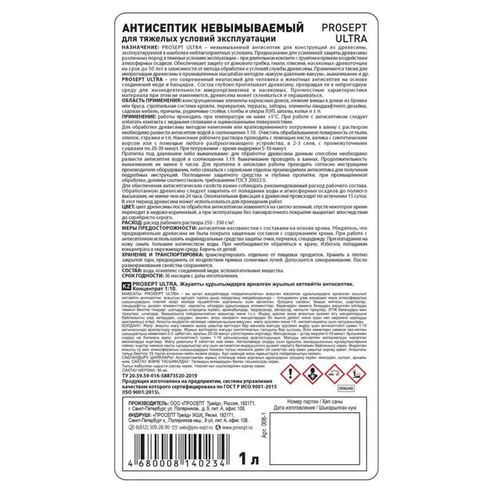 Антисептик невымываемый для ответственных конструкций Prosept Ultra. Концентрат, 1 л — Характеристики