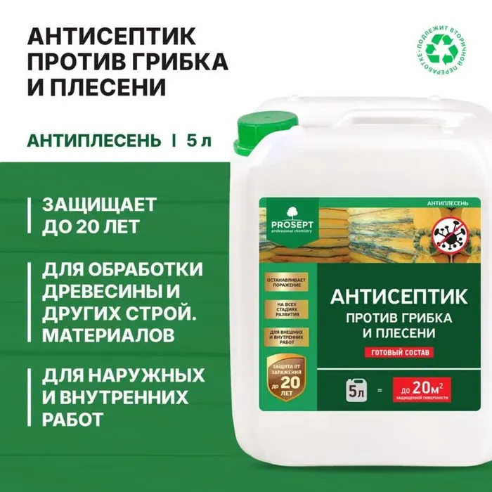 Антисептик универсальный против грибка и плесени Prosept – эффективно предотвращает биопоражение и останавливает уже начавшиеся процессы. Средство на водной основе для внутренних и наружных работ применяется для защиты древесины и любых других строительных материалов от действия дереворазрушающих и деревоокрашивающих плесневых грибов. Используется как защитная пропитка для обработки деревянных стен, балок, несущих брусьев, перекрытий, лаг, стропильных систем, оконных и дверных блоков, деревянной мебели и других элементов из древесины различного назначения. При обработке древесины антисептиком возможно легкое тонирование. Может применяться для обработки и защиты различных поверхностей от плесени – отделочные материалы, гипсокартон, натуральный и искусственный камень, кирпичная кладка, бетон, шифер и т.п. в жилых помещениях, подвалах, овощехранилищах, складах и т.д.