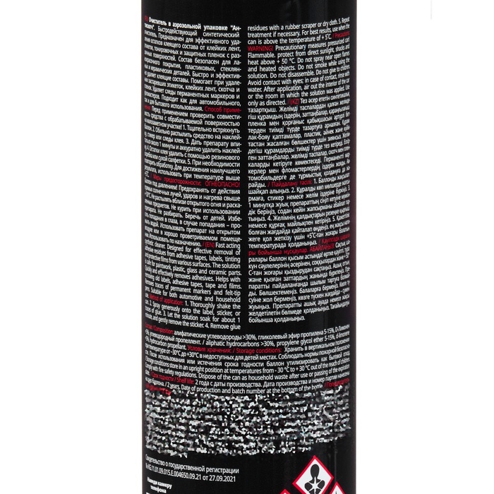Быстродействующий синтетический очиститель. Предназначен для эффективного удаления остатков клеящего состава от клейких лент, этикеток, тонировочных и защитных пленок с различных поверхностей. Состав безопасен для лакокрасочного покрытия, пластиковых, стеклянных и керамических деталей. Быстро и эффективно удаляет клеящие составы. Помогает при удалении застаревших этикеток, клейких лент, скотча и пленок. Удаляет следы перманентных маркеров и фломастеров. Подходит как для автомобильного, так и для бытового использования.