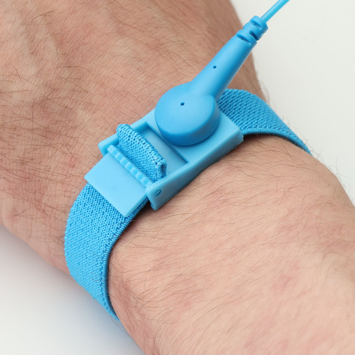 При использовании антистатического браслета электрический заряд не скапливается на теле и одежде человека, а притягивается токопроводящими волокнами и по шнуру отводится от рабочего места на резистор с шиной заземления.