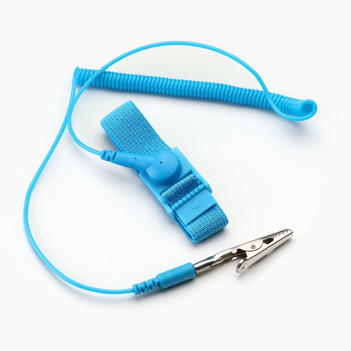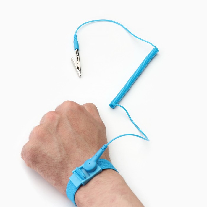 Антистатический браслет для работы с электрическими приборами с эластичной тесемкой и зажимом применяют при работе с электрическими приборами, платами и электронными компонентами для безопасности при пайке легкоплавкими припоями электронных элементов, проводников, во время работы с электрическими цепями. Браслет защищает от статического электричества и напряжения.