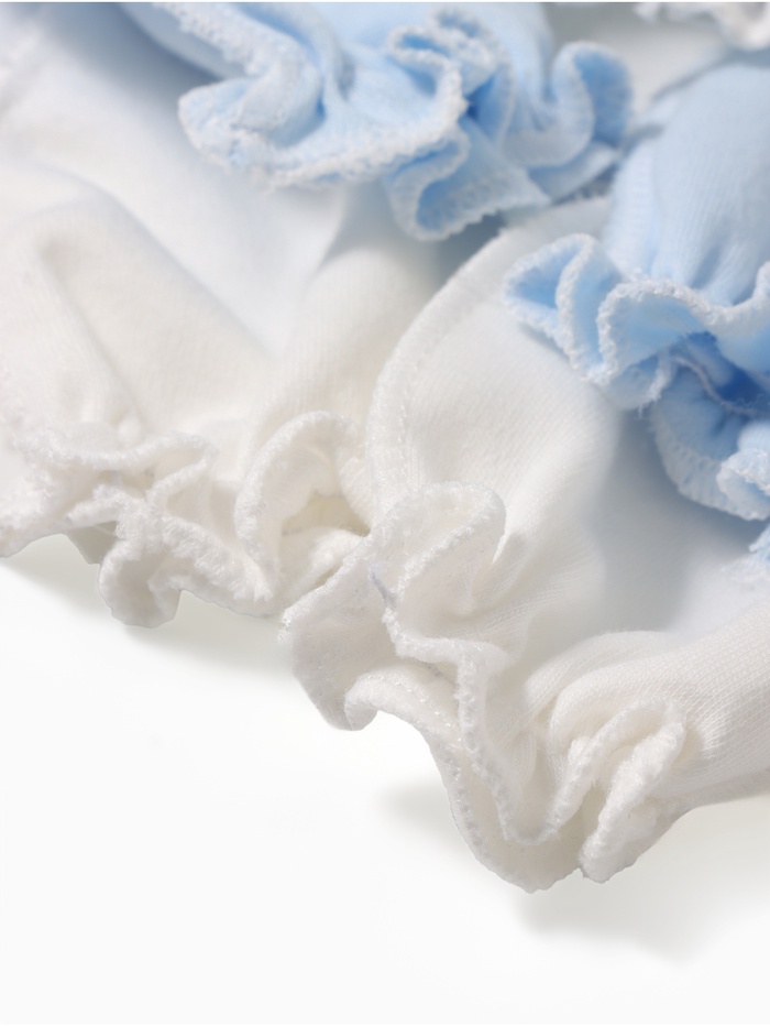 В наборе 4 пары — этого достаточно для регулярной смены. Нежные белые и голубые оттенки подходят для мальчиков и девочек. Универсальный размер рассчитан на возраст от 0 до 6 месяцев.