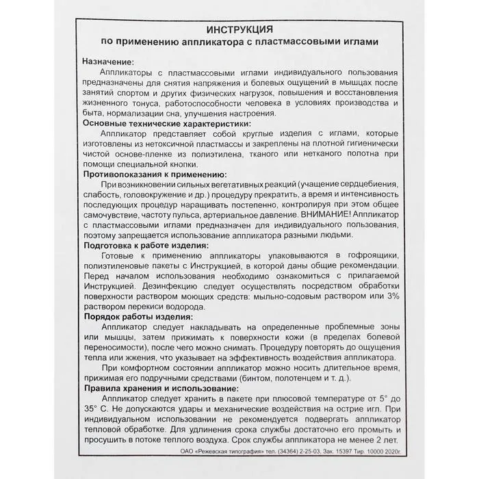 Ипликатор (Аппликатор) игольчатый может быть использован для: ускоренного восстановления работоспособности человека в условиях производства, быту, спорте.