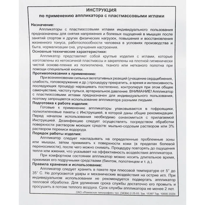 Ипликатор (Аппликатор) игольчатый может быть использован для: ускоренного восстановления работоспособности человека в условиях производства, быту, спорте.