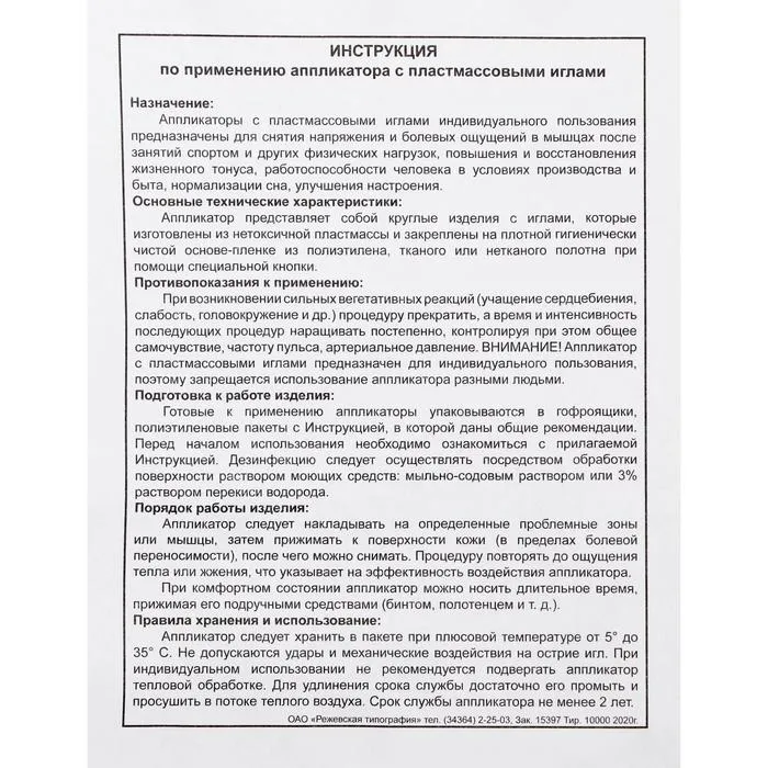 Ипликатор (Аппликатор) игольчатый может быть использован для: ускоренного восстановления работоспособности человека в условиях производства, быту, спорте.