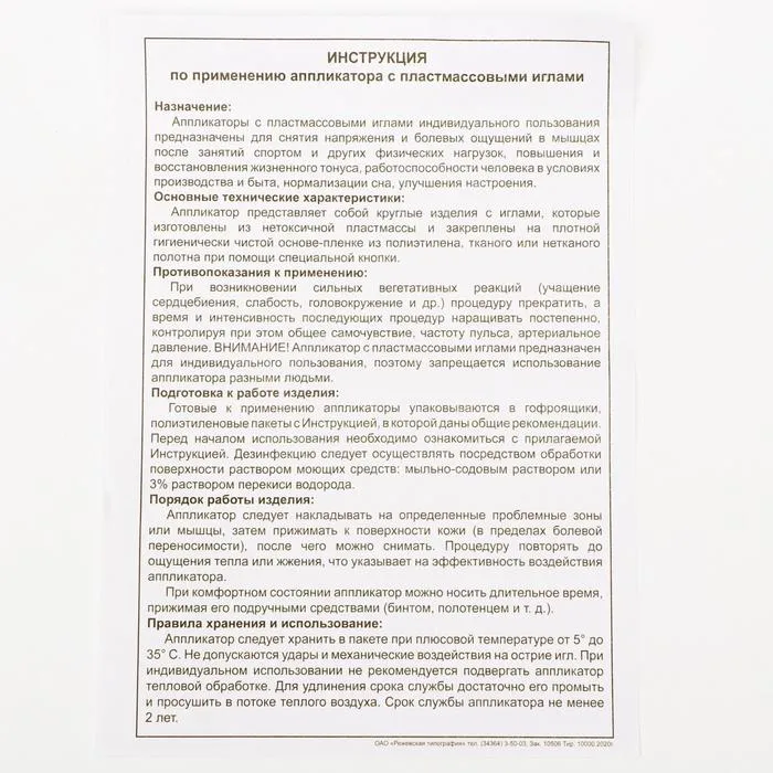 Ипликатор (Аппликатор) игольчатый может быть использован для: ускоренного восстановления работоспособности человека в условиях производства, быту, спорте.