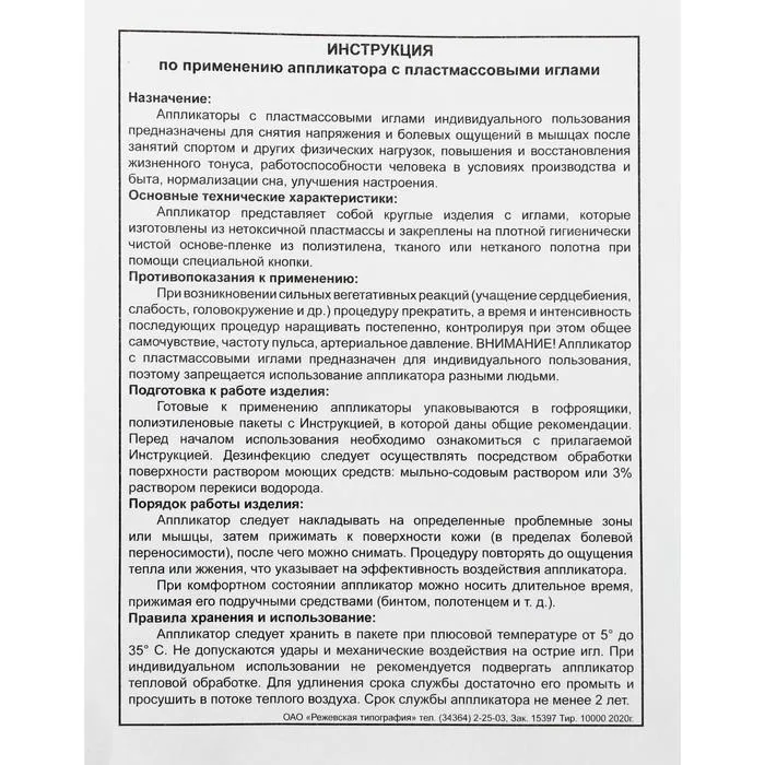 Ипликатор (Аппликатор) игольчатый может быть использован для: ускоренного восстановления работоспособности человека в условиях производства, быту, спорте.