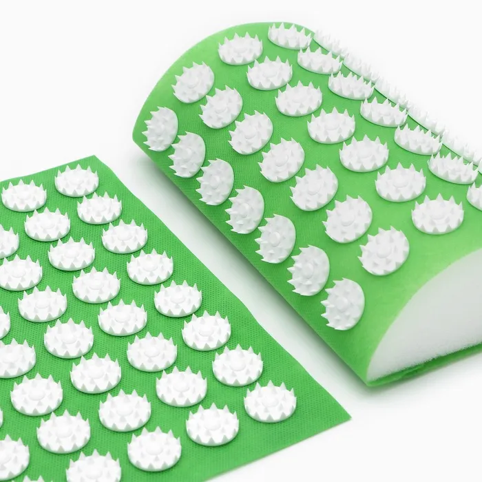 Аппликатор Кузнецова комплект, представленный в зеленом цвете, состоит из пластины размером 260 х 560 мм и валика 140 х 230 мм, каждый из которых оснащен 144 колючками. Изделия изготовлены из долговечного и практичного спантекса, обеспечивающего комфортное использование.