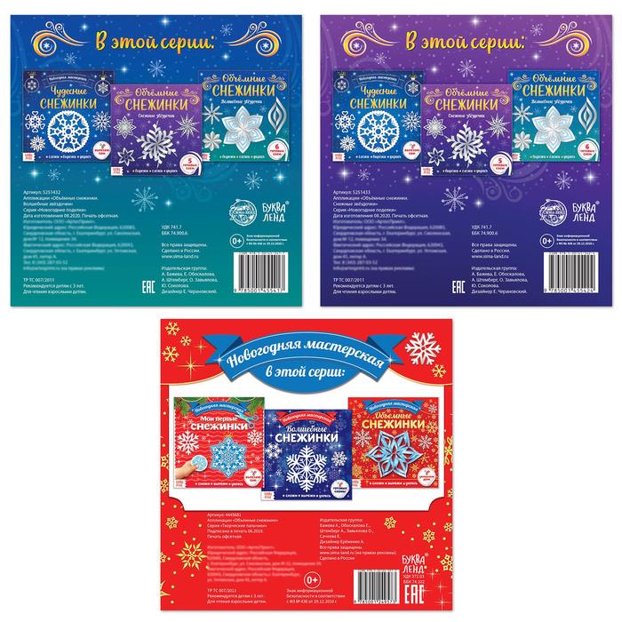 Набор аппликаций «Объёмные снежинки» включает в себя 3 книги со схемами снежинок, а именно: