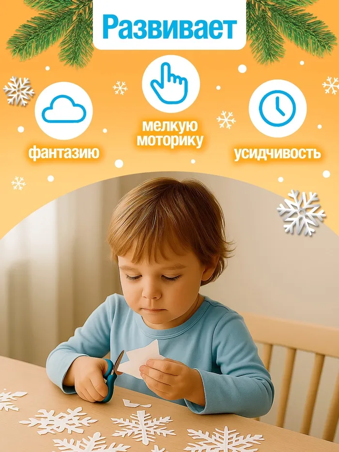 С набором книг аппликаций «Новогодняя мастерская снежинок» малыш устроит дома новогоднюю мастерскую. С помощью ножниц ребёнок вырежет праздничный декор по заготовленным схемам, а затем украсит комнату получившимися зимними кристалликами.