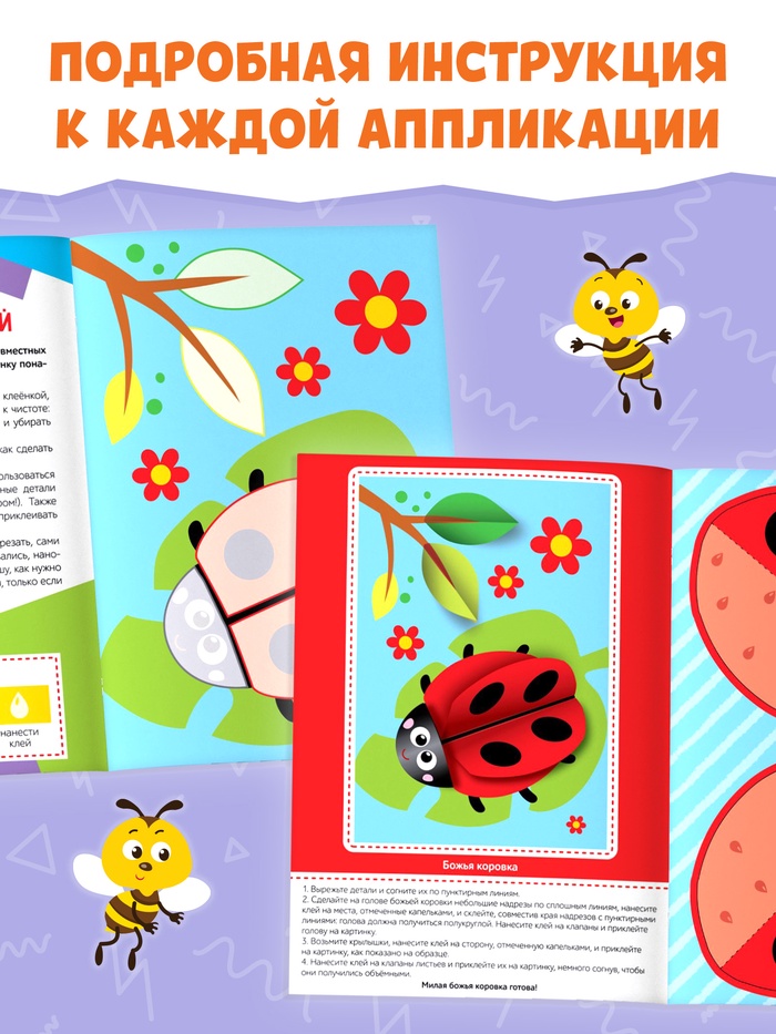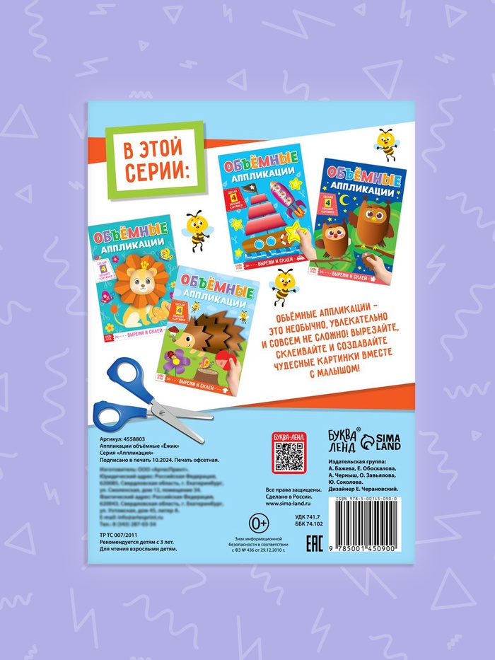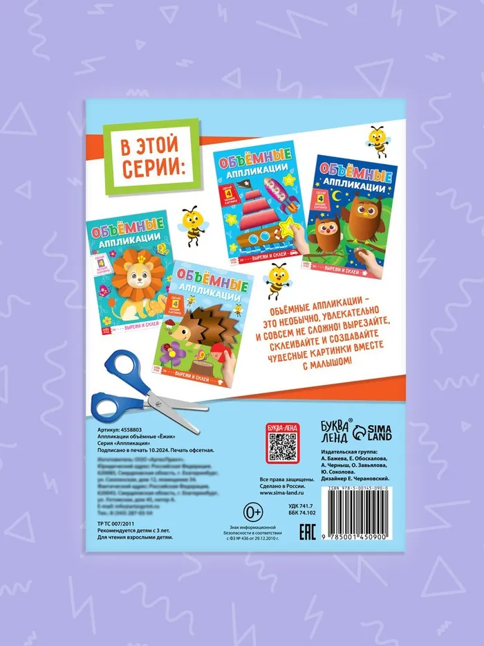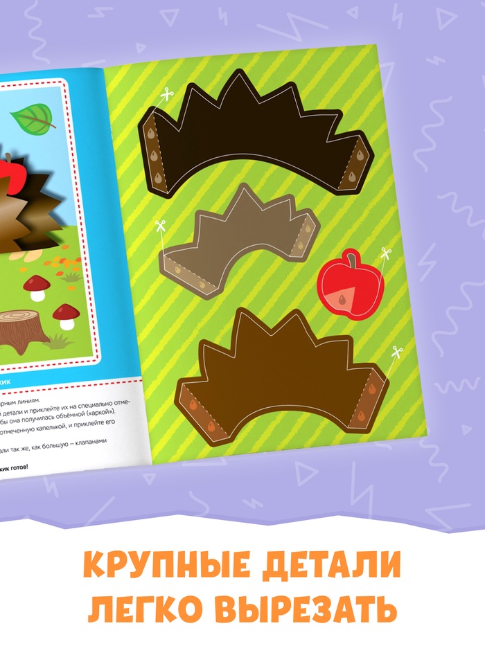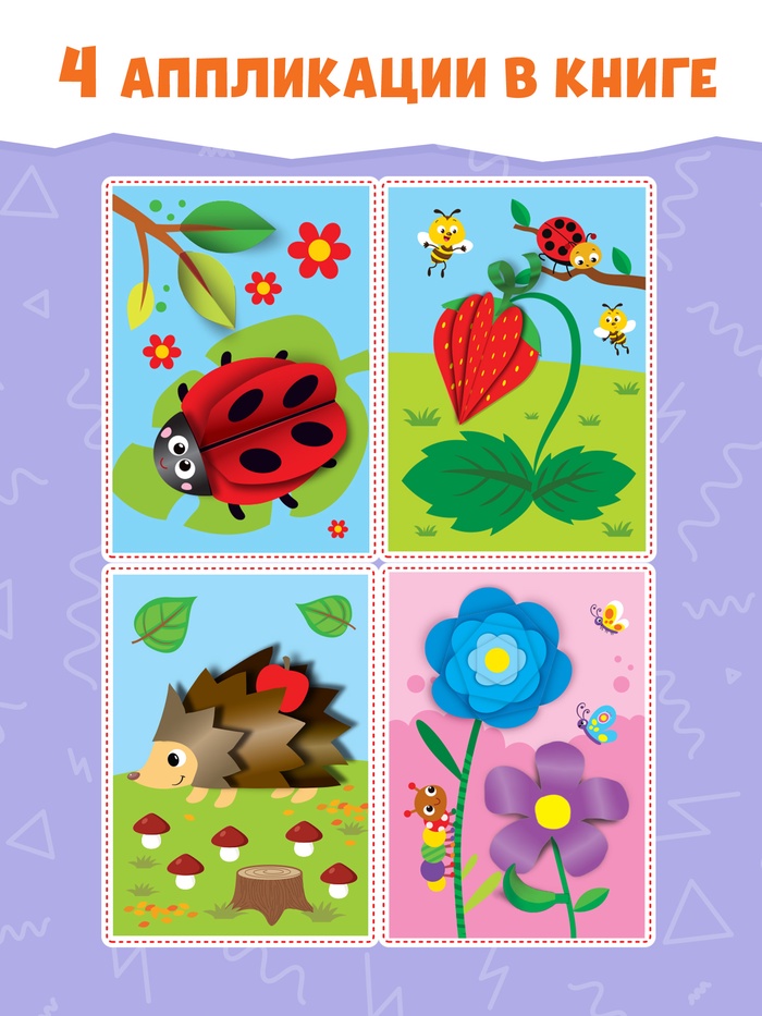 Аппликации объёмные «Ёжик» — 20 страниц удовольствия для вашего ребёнка и 4 поделки, собранные своими руками. Любимые зверушки, птички, ягоды и фрукты — всё это вы встретите на просторах книги!