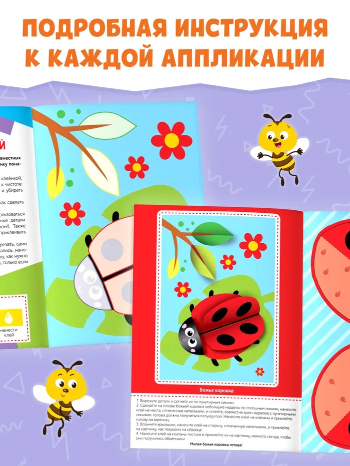 На каждой странице подробно описаны правила создания аппликации. Для работы малышу потребуются ножницы, клей и ваша помощь. Для удобства в книге есть условные обозначения необходимых действий: вырезать, согнуть, завить ножницами, нанести клей.
