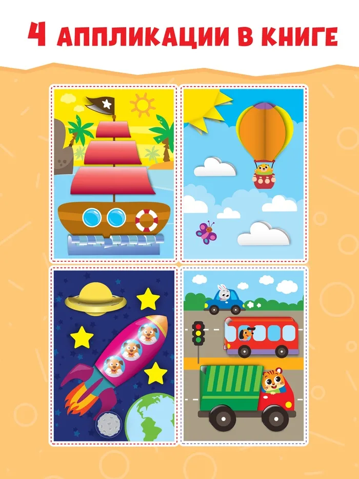 Аппликации объёмные «Кораблик» — 20 страниц удовольствия для вашего ребёнка и 4 поделки, собранные своими руками. Космические ракеты, морской транспорт и много всего интересного вы встретите на просторах книги!