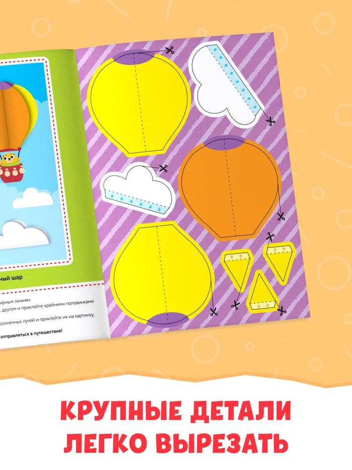 На каждой странице подробно описаны правила создания аппликации. Для работы малышу потребуются ножницы, клей и ваша помощь. Для удобства в книге есть условные обозначения необходимых действий: вырезать, согнуть, завить ножницами, нанести клей.
