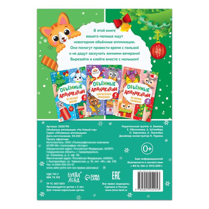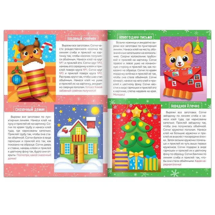 В этой книге ребёнка ждут объёмные аппликации. Его задача: вырезать фигурки из бумаги и приклеить их на основу. В итоге получится 4 готовых картинки.
