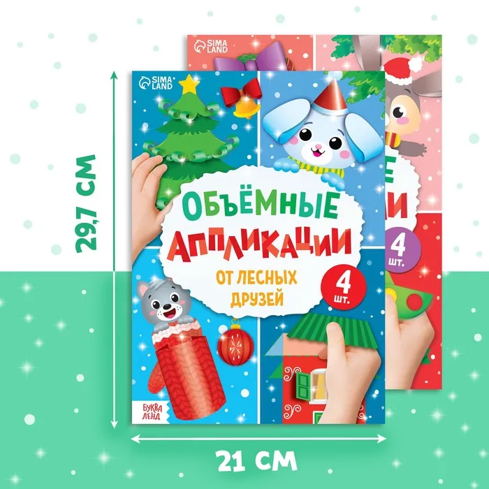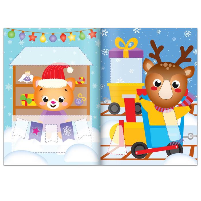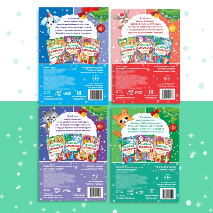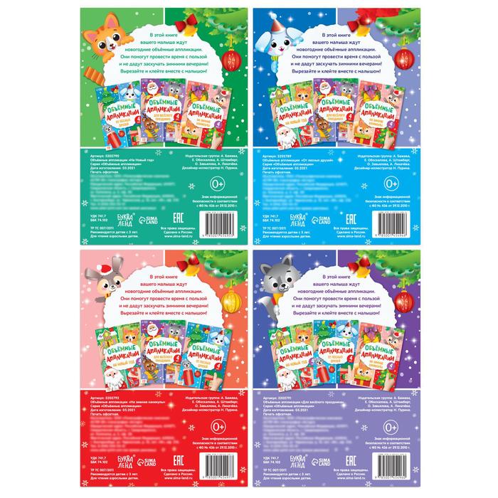 В этом наборе ребёнка ждут объёмные аппликации. Его задача: вырезать фигурки из бумаги и приклеить их на основу. В итоге из каждой книги получится по 4 готовых картинки.