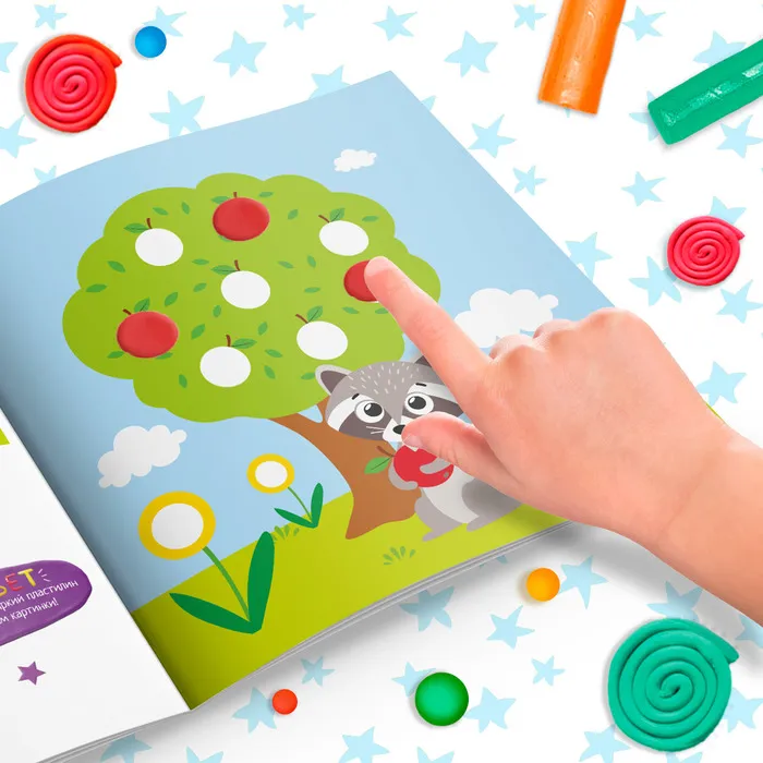 Сделать картинки очень просто: необходимо покрыть пластилином бесцветные детальки. На каждой страничке подробно описана пошаговая инструкция для родителей. Материал мягкий и приятный на ощупь.