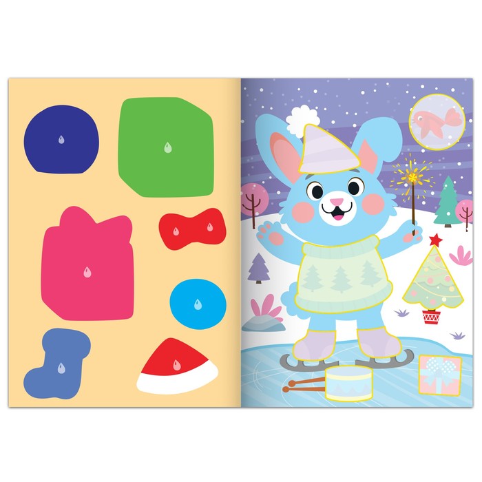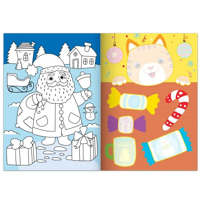 - Внутри есть раскраска с новогодними персонажами — крупные элементы легко и интересно раскрашивать.