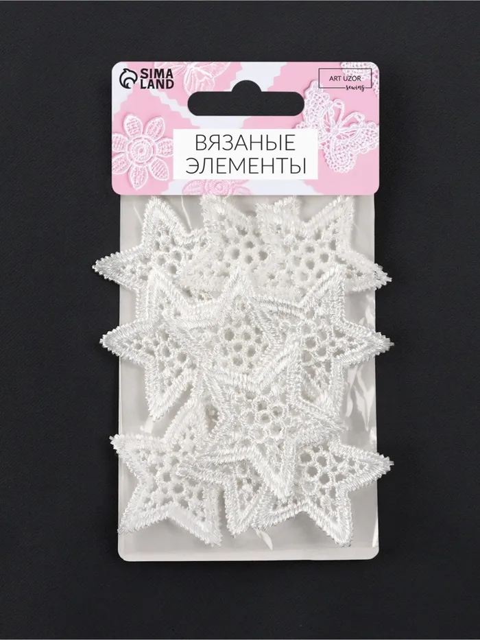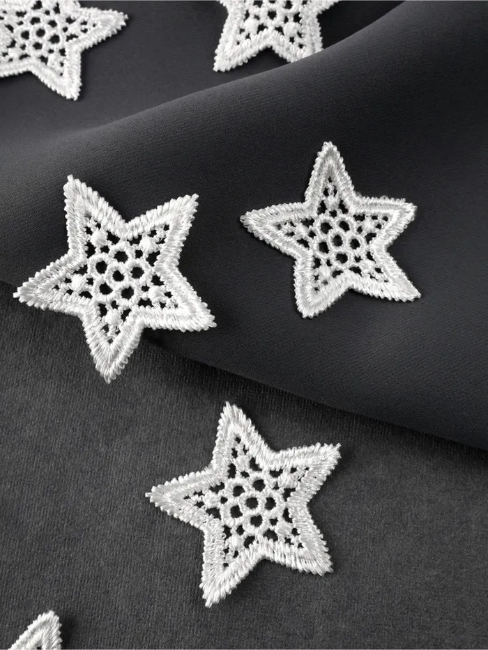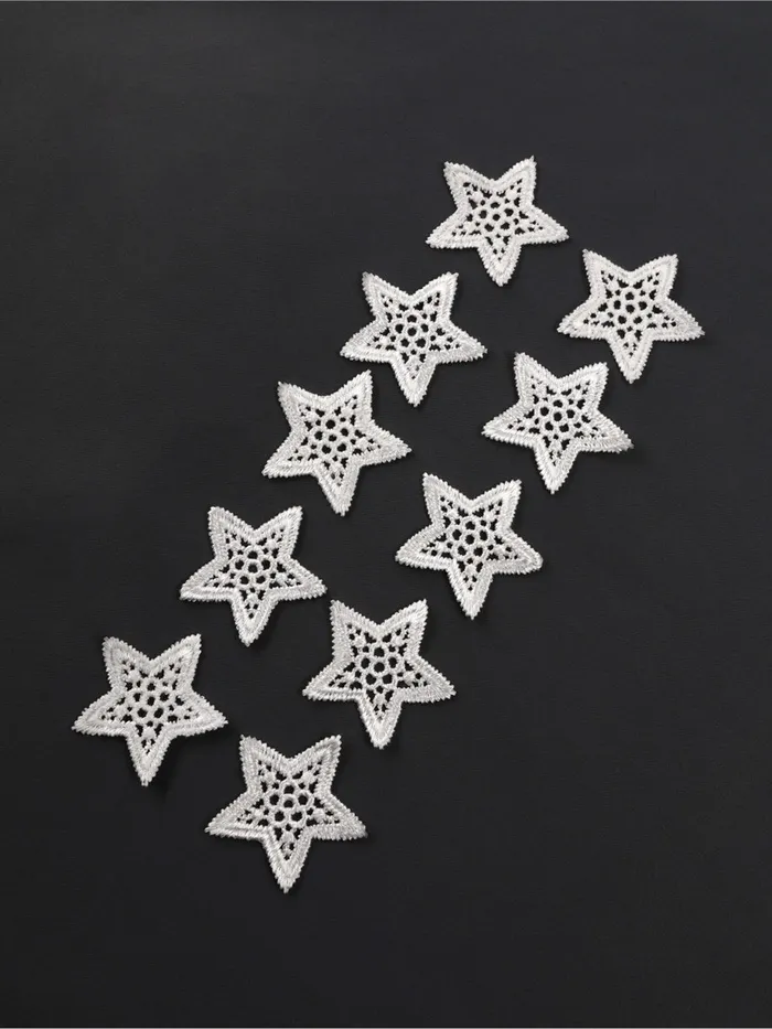 Превратите свои творческие задумки в реальность с этими изящными кружевными аппликациями в форме звёзд. Набор из десяти белоснежных элементов, выполненных из высококачественного полиэстера, станет идеальным решением для декора одежды, аксессуаров или предметов интерьера. Каждая звезда диаметром 4 см — это гармоничное сочетание элегантности и практичности.