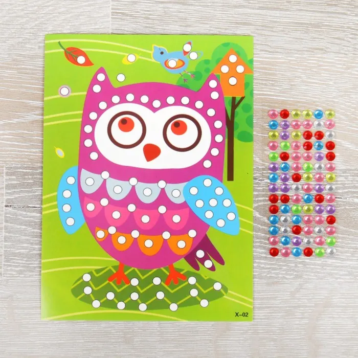 Аппликация круглыми стразами — это хороший набор для творчества, подходящий детям от 3 лет. Вы сможете вместе с ребёнком провести совместный досуг за картиной и создать яркий, забавный рисунок, которым потом можно будет украсить интерьер детской спальни. Стразы прикрепляются на обозначенные белым цветом поля, благодаря чему ребёнок тренирует внимание, мелкую моторику и усидчивость.