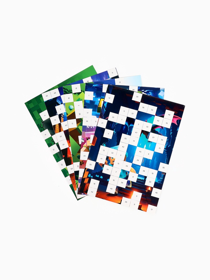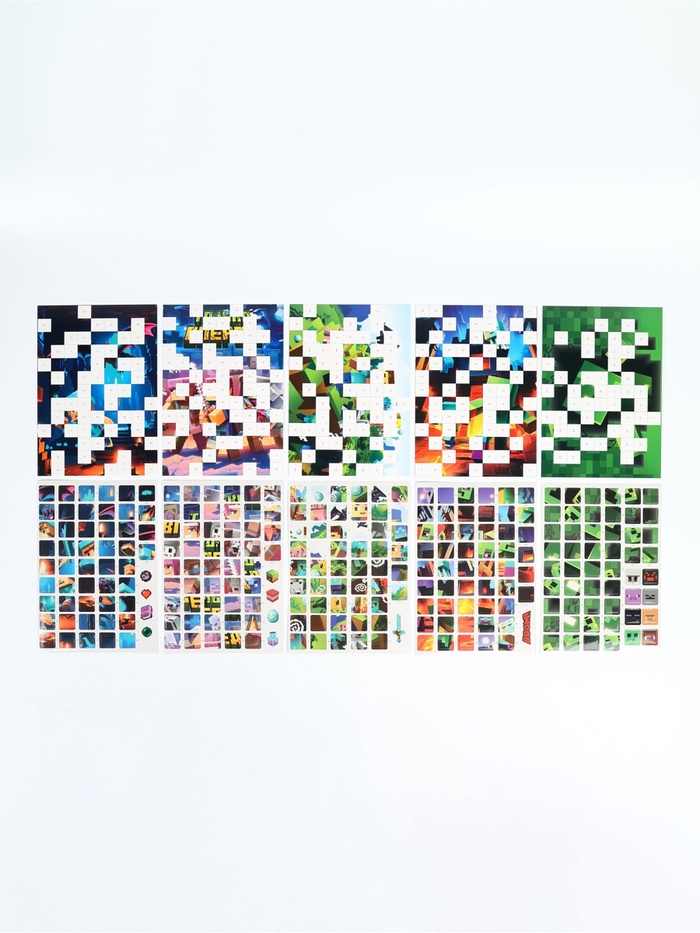 С набором «Пиксельный мир» дети и взрослые смогут собрать красочную картину в стиле пиксель-аппликации. Нужно всего лишь разместить наклейки определённых цветов на соответствующие клетки, и постепенно появится яркая картина в пиксельном стиле.