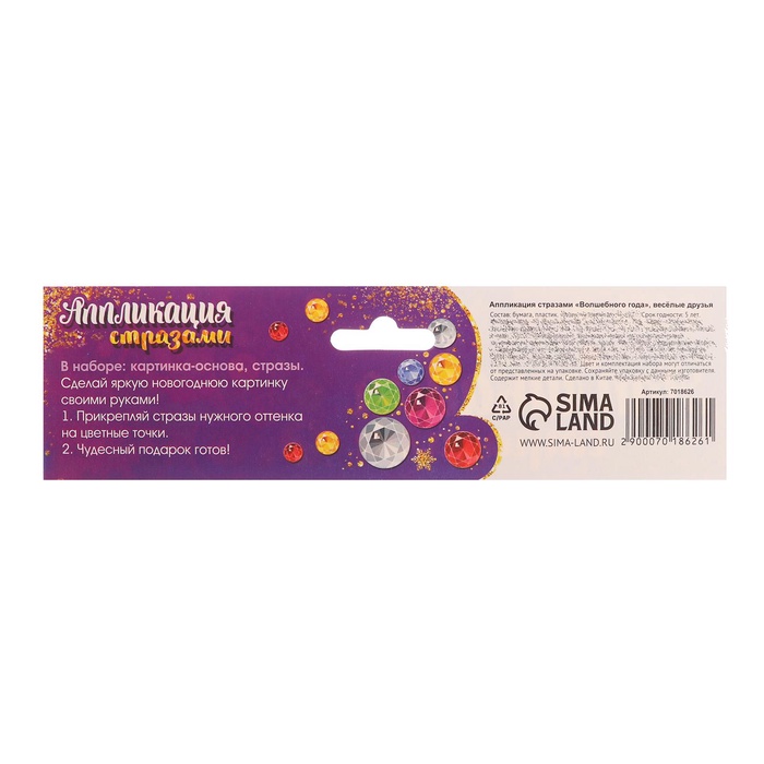 Данный набор для творчества поможет малышу самостоятельно сделать сверкающую картину. В процессе работы ребёнок будет просто снимать стразы с плёнки и раскладывать на изображение по схеме. Благодаря клеевому слою все элементы декора легко крепятся и хорошо держатся на рисунке.