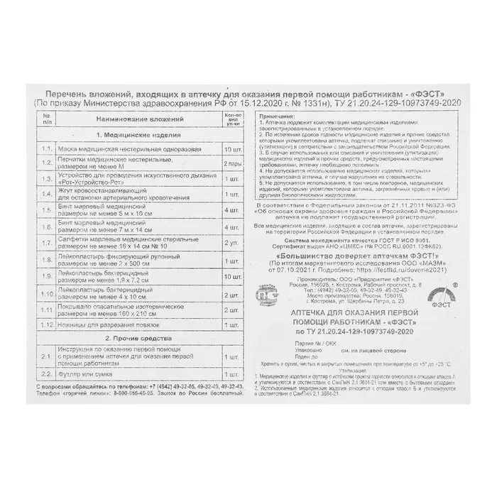 Аптечка для оказания первой помощи работникам «ФЭСТ», футляр 8-2 — Характеристики