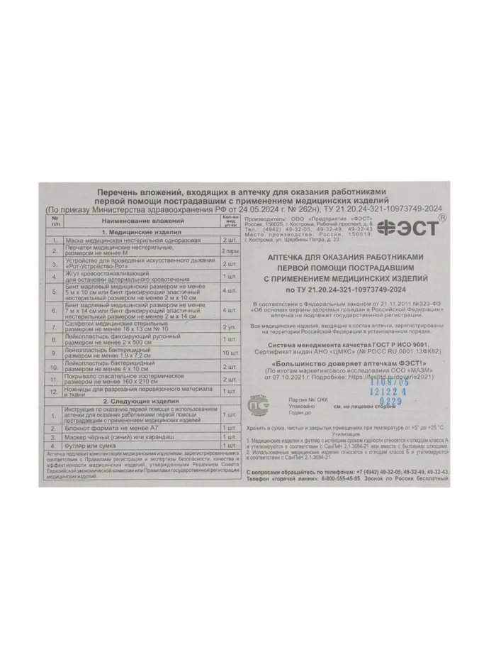 Аптечка для оказания первой помощи работникам «ФЭСТ», футляр №2, приказ 262н — Характеристики