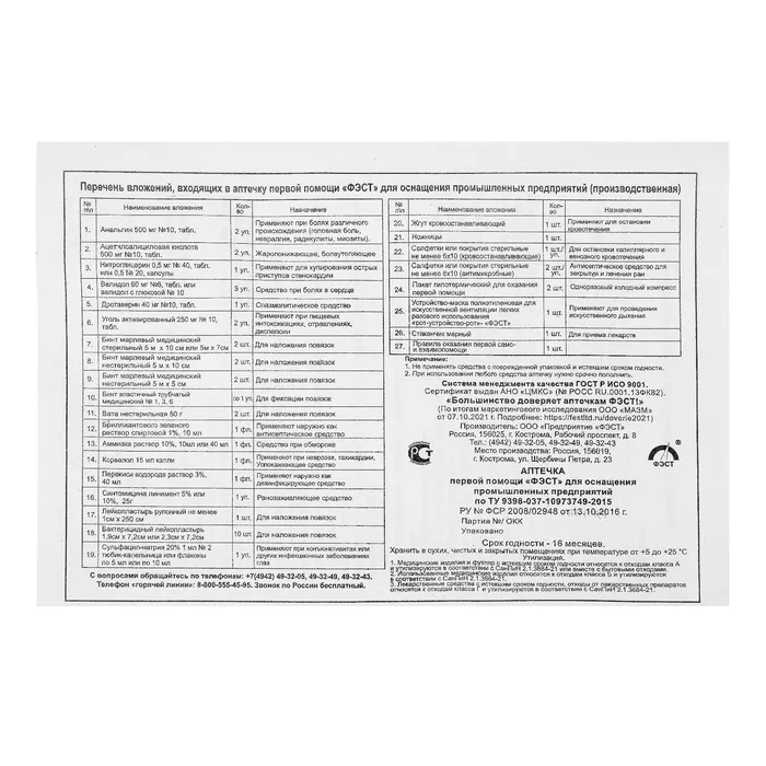 Аптечка для оказания первой помощи работникам «ФЭСТ», мягкий футляр, зелёная — Характеристики