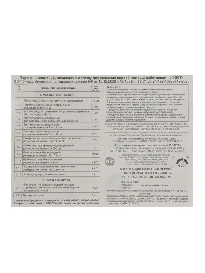 Аптечка для оказания первой помощи работникам «ФЭСТ», приказ 1331н, футляр 8М — Характеристики