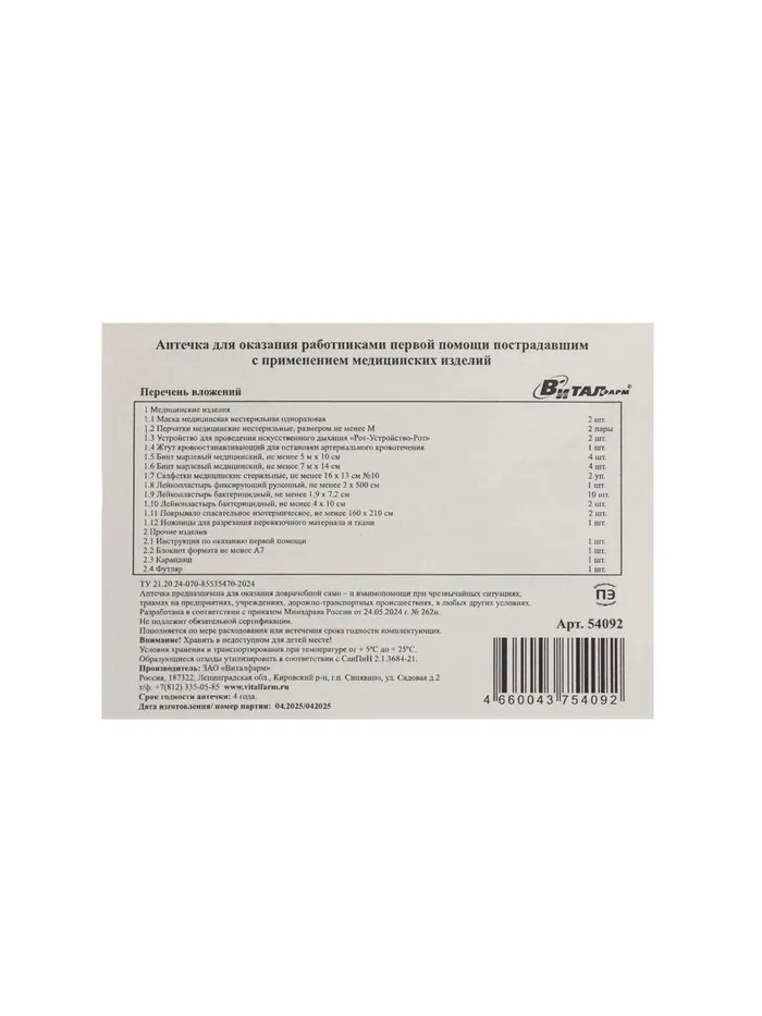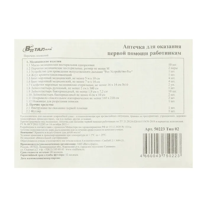 Аптечка для оказания первой помощи работникам Виталфарм, по приказу № 262н, пластик — Характеристики