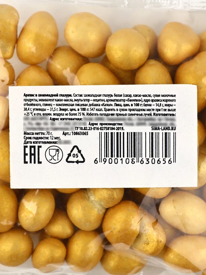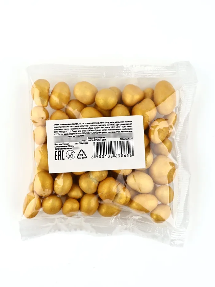 Состав: шоколадная глазурь белая (сахар, какао-масло, сухие молочные продукты, эквивалент какао-масла, эмульгатор - лецитин, ароматизатор "Ванилин"), ядро арахиса жареного отбелённого, глянец - комплексная пищевая добавка "Капол".