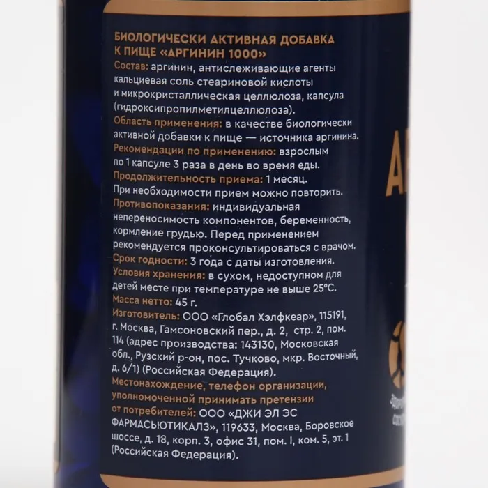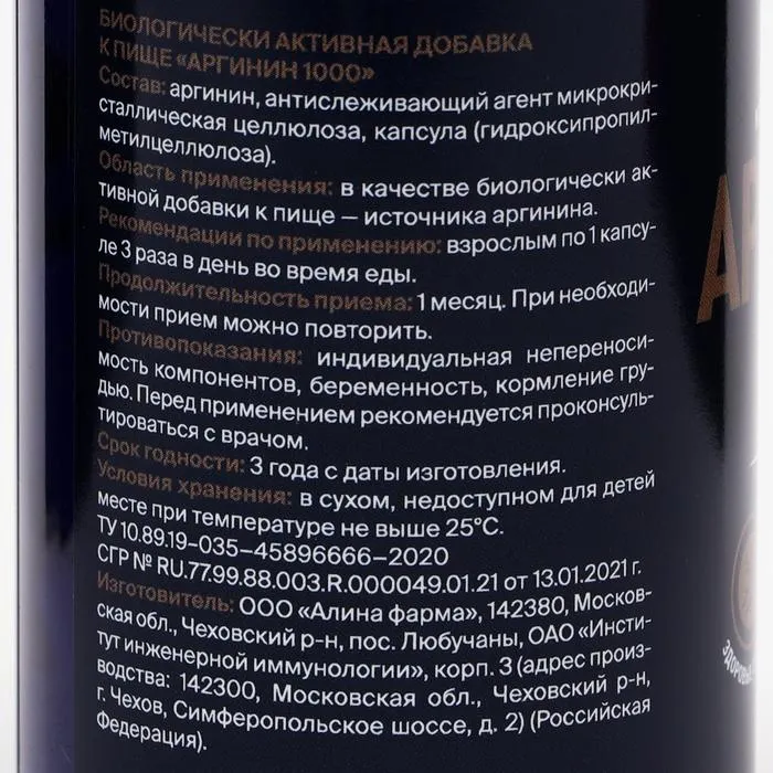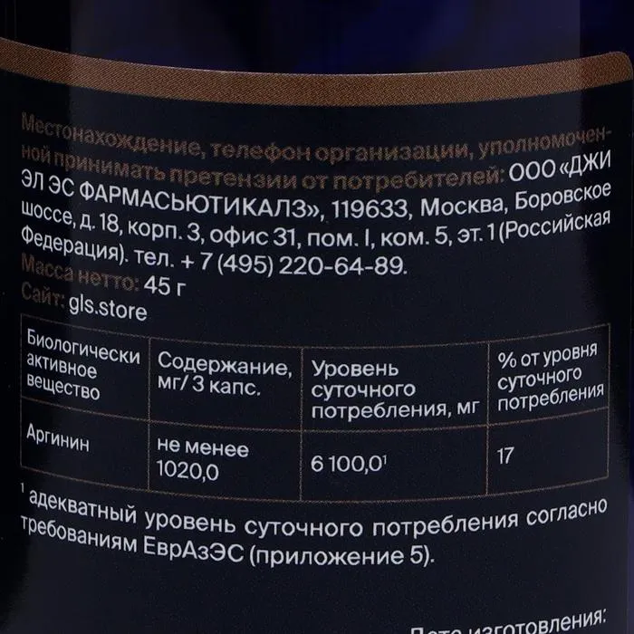 Состав: 3 вегетарианские капсулы содержат аргинина 1000 мг