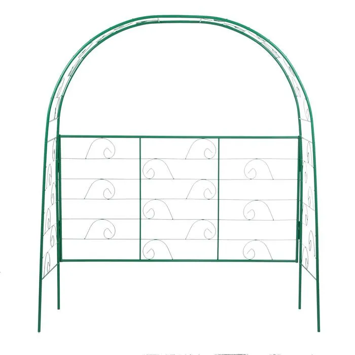 Лёгкая конструкция из металла выдерживает вес растений, устойчива к воздействию осадков и температуры. Под аркой не нужен фундамент, вы можете разбирать её и переносить по участку. От коррозии изделие защищает краска зелёного цвета, которая гармонирует с листьями.